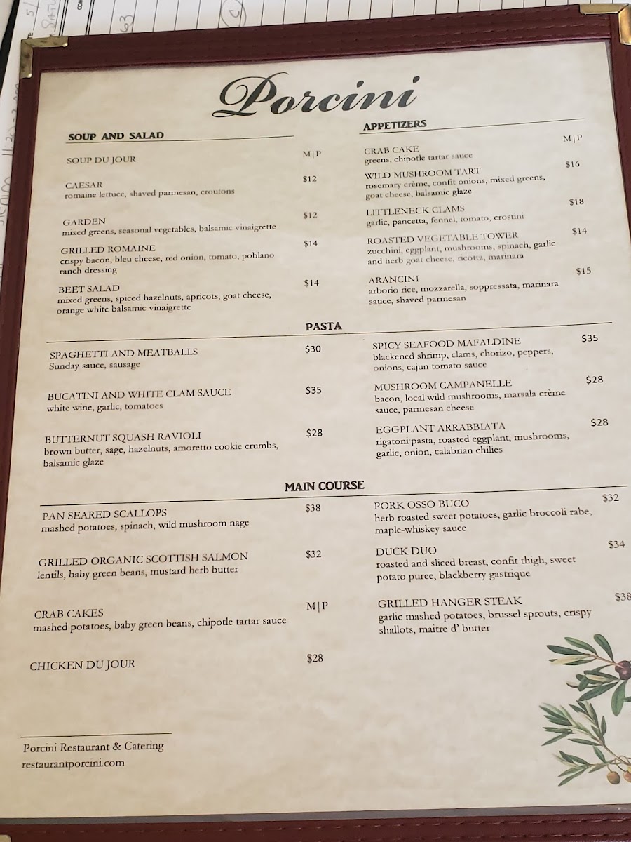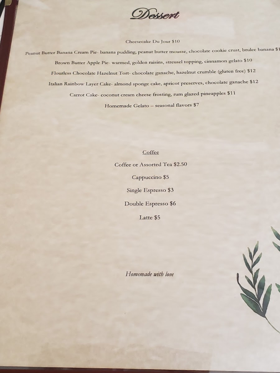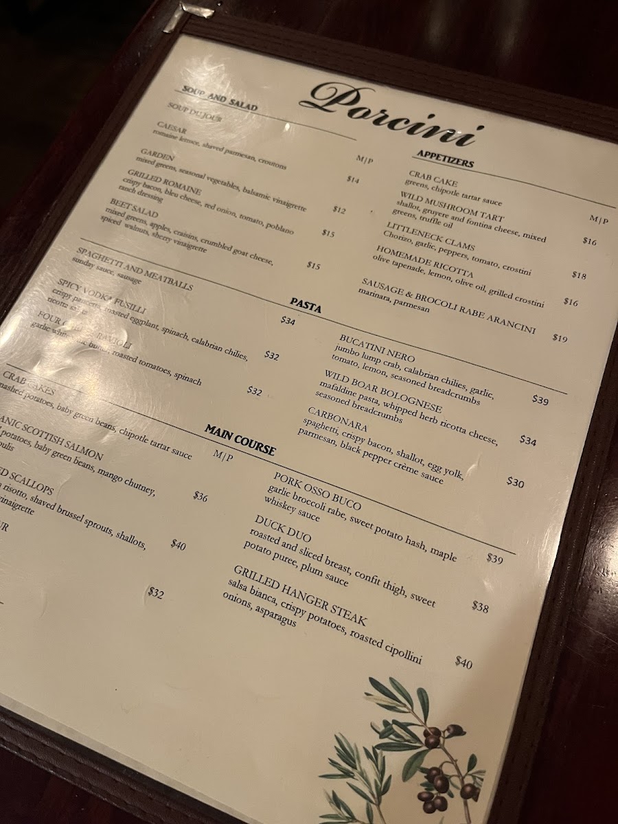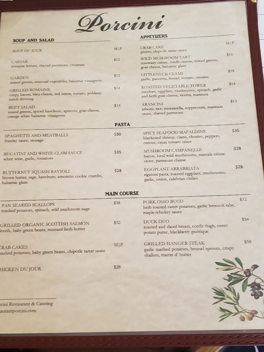 Viewed as a whole, the menu at Porcini Highlands reads like a confident showcase of classic comfort and refined Italian-American cooking, balancing savory mains, thoughtful salads, and an indulgent dessert lineup. Starters and lighter options such as Salad Mixed Greens, Farro Salad, Kale and Brussels Sprouts Salad, Fresh Fruit, and the warming Potato Leek Soup set a clean, seasonal tone before moving into heartier plates. Entrées like Chicken and Waffles deliver familiar comfort with polish, while Butternut Squash Ravioli, Eggplant Rollatini, and Swordfish reflect a menu that respects both tradition and balance. The inclusion of Crab Cake and the slow-braised Osso Buco adds depth and a sense of occasion, rounding out the savory side with dishes that feel deliberate rather than excessive. Desserts are where the menu truly indulges, offering a wide spectrum of flavors and textures: from the rich German Chocolate Cake and Flourless Chocolate Hazelnut Torte to the rotating charm of Cheesecake Du Jour and the bright finish of Key Lime Cheesecake. Crowd-pleasing sweets like Tiramisu, Almond Joy Cheesecake, Caramel Apple Pie Gelato, and Home Made Cookies and Baklava reinforce the restaurant’s dessert-forward appeal, while a well-chosen selection of Wine ties the entire experience together. Taken together, the menu feels cohesive and complete, designed to satisfy a range of tastes without losing its identity.